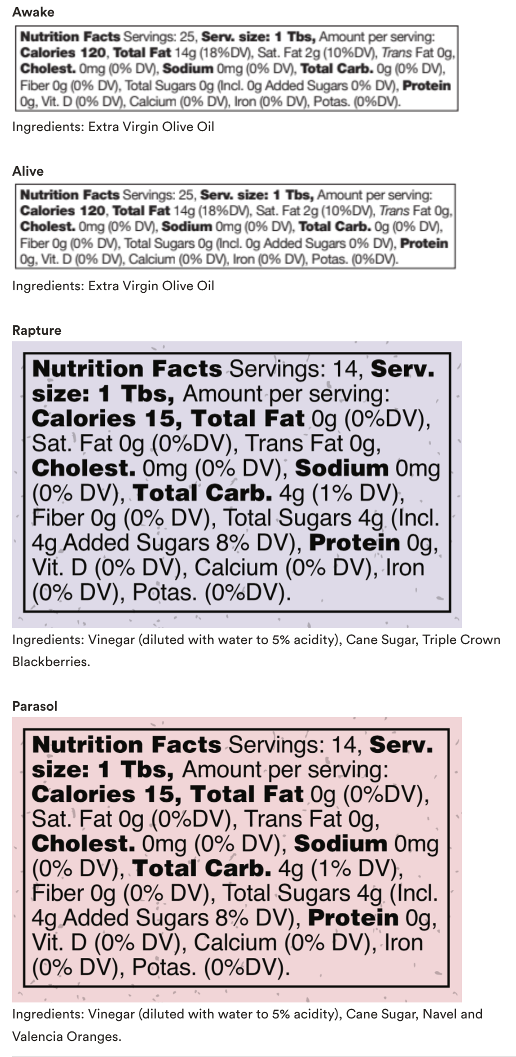 The oils and vinegars are delightful. Enjoy making salads and cooking with these. So flavorful. Had a little difficulty sending them as a gift to another state. Service department assisted me very quickly. Recipients loved the present. I will definitely turn to this company as future needs for presents arrive.