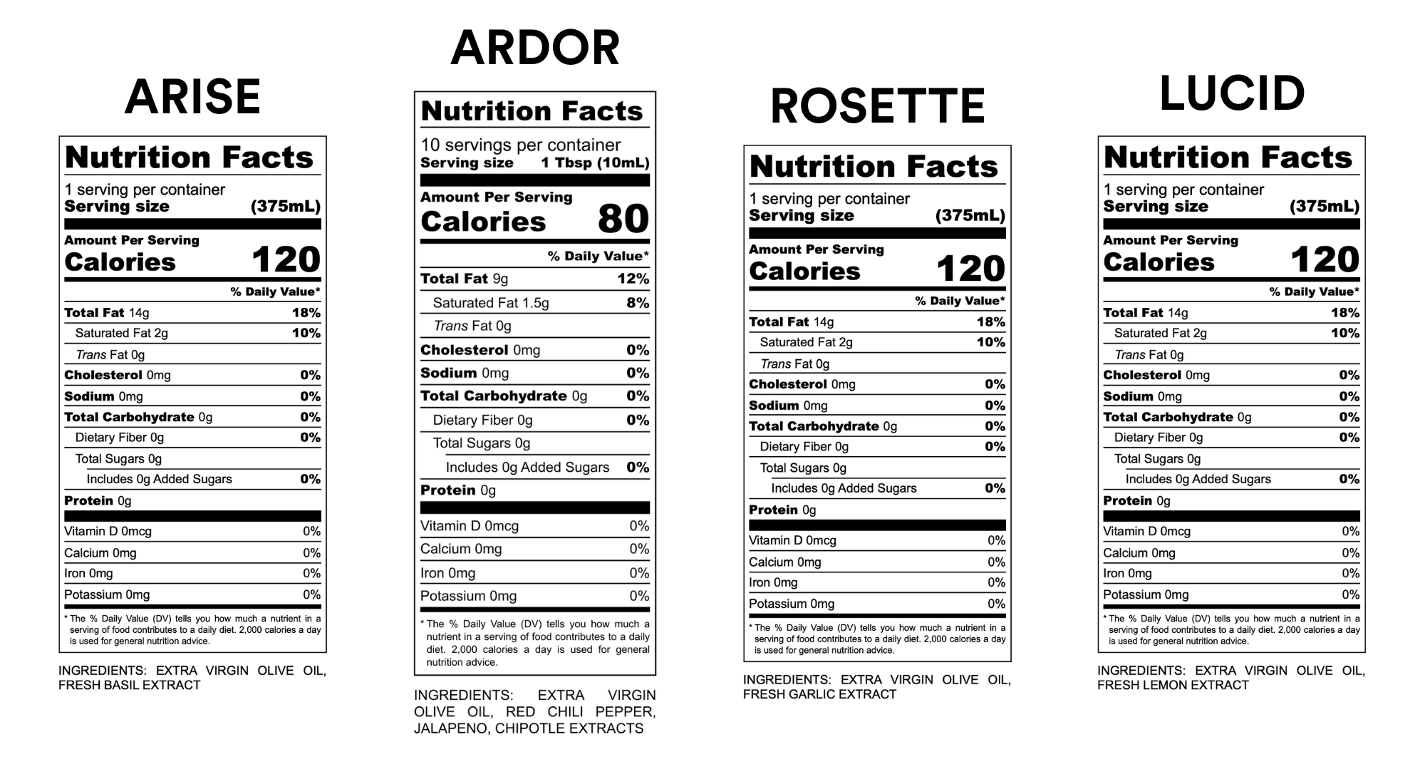 Ardor, Lucid, Rosette and Arise olive oils are made with Arbequina and Arbosana olives.