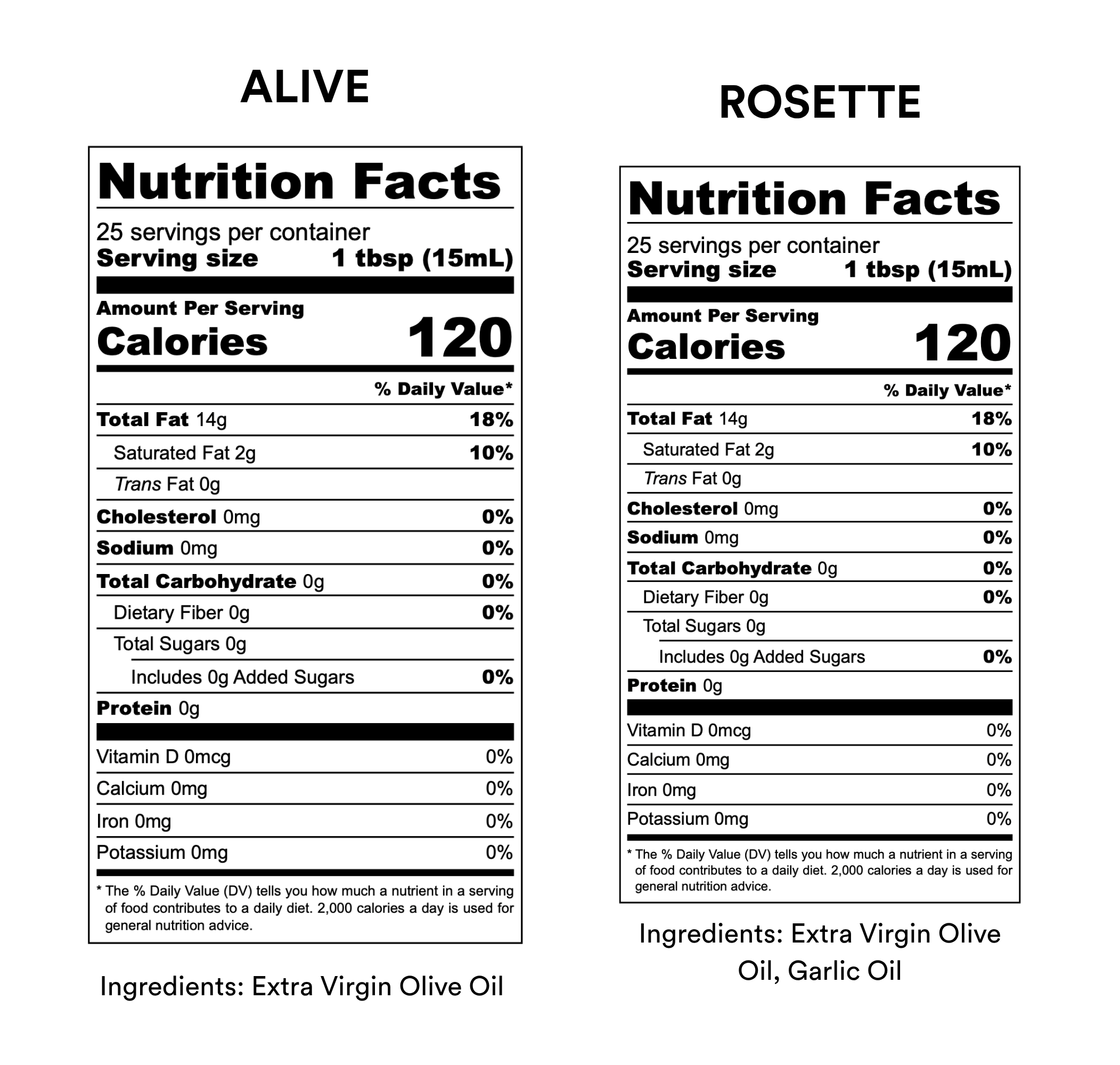 Alive is made with Arbosana and Koroneiki olives, harvested in October 2024. Rosette is made with Arbequina and Arbosana olives, harvested in November 2024.