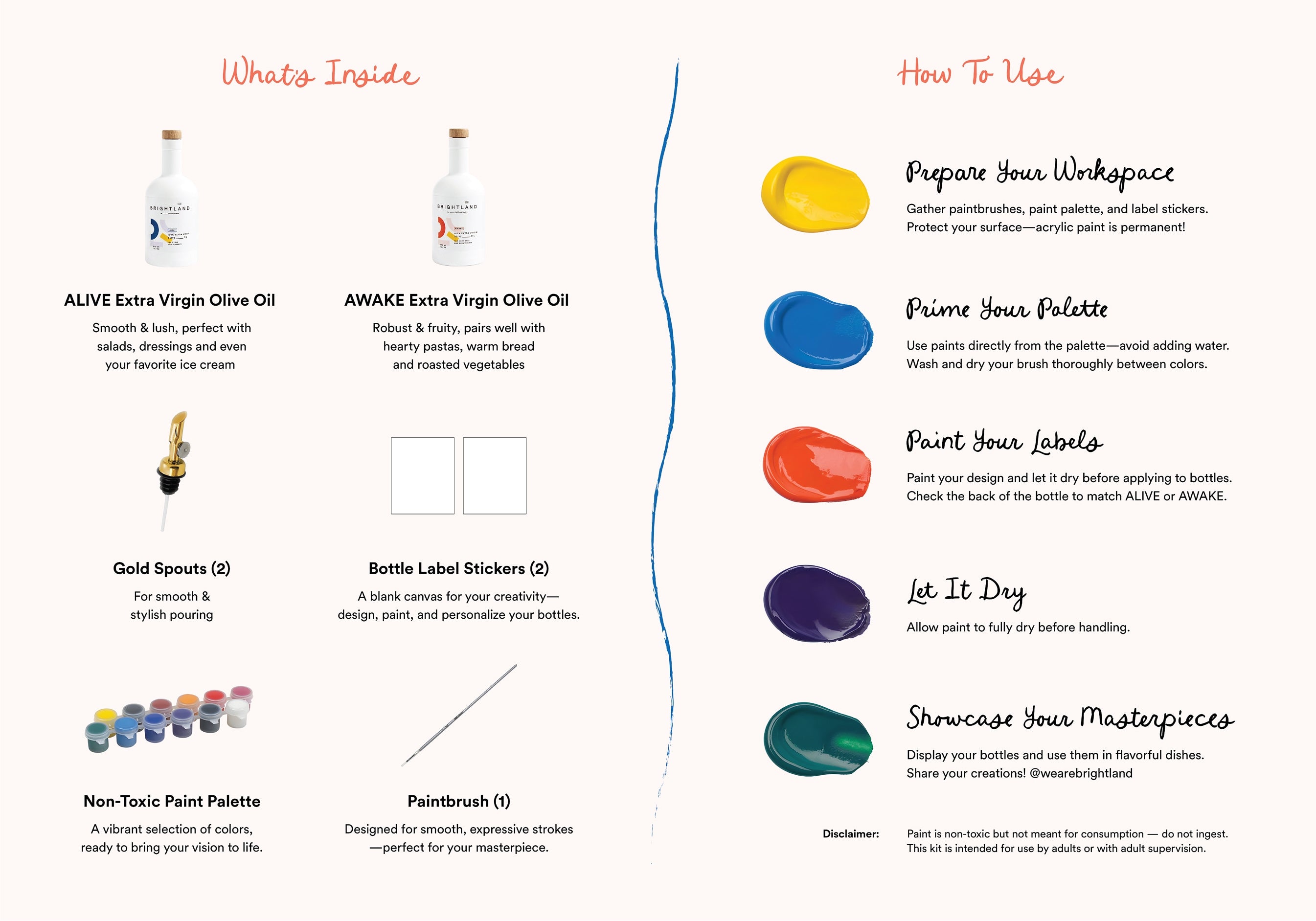 Brightland’s Paint & Pour set invites you to turn our olive oil bottles into works of art. Whether you’re crafting a keepsake or sharing a joyful moment with your mom, this set is designed to inspire creativity and connection between loved ones.